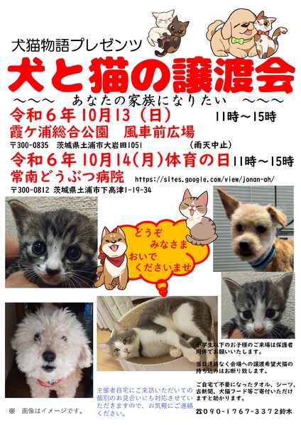 | イベント内容 | 御世話になっている常南どうぶつ病院さんでの譲渡会です。 犬と猫の譲渡会です。 毎回、色んなところからの家族を探す犬猫が参加します。 あなたとの出会いを待つワンニャンにぜひ会いにきてくださいませ。 11時~15時開催です ●犬猫物語は土浦を中心とし保護活動、野良猫の避妊去勢などを行っている団体です。 犬猫の相談などはお電話くださいませ。 譲渡会への猫の参加も受け付けております。 当日いきなりの参加は不可能ですが、事前にご連絡ください。 お待ちしています(^^ 問い合わせは09017673372鈴木まで。非通知には出ません。 駐車場は病院の前と、菊地内科さんの駐車場をお使いくださいませ。 菊池内科さんに感謝です。 |