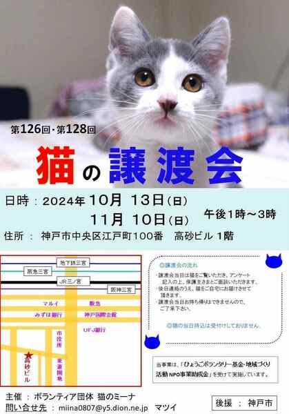 | イベント内容 | 今年生まれの仔猫も多数、参加予定です! もちろん、大人猫もいます! お家の家族になる猫との出会いに、来て下さればと思います。 ペット不可にお住まいの方は、ご遠慮頂いております。(今一度、ご確認ください!) 猫の里親を探されている、保護者の方の 参加猫の参加も受け付けをして おります。 ご希望の方は、 miina0807@y5.dion.ne.jp にご連絡を頂ければと思います。 会場に来られる際には、体調がすぐれない・発熱のある場合は、ご遠慮頂ければと思います。 毎月、譲渡会は開催いたしますので次回の縁にご期待ください! |
