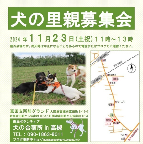 | イベント内容 | ※屋外会場での里親募集会です。雨天時は中止にする可能性がありますので電話でご確認ください。 犬によっては別会場をご案内できる場合があります。 (電話でのお問合せ→090-1863-8011) ※先住ワンちゃんを連れて会いに来て頂けます。相性を見るためにも、是非是非、連れてきてください。 ※近付きましたら「犬の合宿所in高槻」のブログでも参加予定犬等の情報を紹介していきます。 http://inunogassyukusyo.seesaa.net/article/505587059.html 予約は不要ですが、参加犬が直前に変更する場合がありますので、特に会いたいワンちゃんが決まっている場合は事前にご確認頂く方が確実かと思います。 【お問合せ】 090-1863-8011 ・・・・・・・・・・ 【アクセス】 ・阪急京都線 富田駅から徒歩約10分 ・JR京都線 摂津富田駅から徒歩約12分 ※隣接する富田支所と公民館の駐車場は使えませんが、会場広場内に駐車できる場合があります。 事前にご確認ください。(090-1863-8011) ・・・・・・・・・・ 市民ボランティア「犬の合宿所in高槻」は、現地での譲渡が難しい離島の保健所収容犬を引き取り関西で新しい飼い主探しをしています。 保護犬を家族として迎えることが文化として定着し、生体販売に伴う悲惨な繁殖犬の存在がなくなることを願っています。 ・・・・・・・・・・・・・・・・・・・・・・・・・・・・・ ★ 一時預かりさんや犬の搬送ボランティアさん、里親募集会の当日お手伝いの方など常時募集しています。 ★犬によっては個別お見合いできる場合があります。 里親募集会に参加できない方で個別お見合いをご希望の方は、預かりさんとの日程調整が必要ですので、電話でお問合せください。⇒090-1863-8011 |