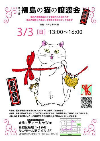 | イベント内容 | 第19回 福島の猫の譲渡会 ・主催 たてむすびの会 東日本大震災、原発事故の避難で飼い主さんが手放さざるを得ない子や被災地に取り残された猫たちの譲渡会です。 震災直後から長く保護されていて参加する猫、人の住むことが許されない地で生まれ保護された子など様々です。 未曽有の災害を生き抜いてきた命に、安心できる家と生涯の家族を見つけたい。 まだまだ被災猫はたくさんいるのです。 【参加猫】 お留守番もできる成猫、シニア猫および2018年生まれの若猫たちの参加となります。 (若猫を除き基本的に避妊去勢は済んでいます) ご年配の方、お一人暮らしの勤労者などでも一緒に暮らせる猫もおります。 猫の適正や、後継者及びお住まい等の条件にもよりますのでご相談の上となりますが、ぜひご来場お待ちしております。 未曽有の災害を生き抜いてきた命に、安心できる家と生涯の家族を見つけたい。 まだまだ被災猫はたくさんいるのです。 猫の性格によっては譲渡会後、預かり宅にての再お見合いの設定もしております。 随時参加猫は紹介していきます。 【会場】 紅茶とワインのお店 ディーカッツェ 猫の居るカフェが会場です 新宿区新宿1-19-8 サンモール第七ビル2F ※当日カフェへの道案内以外でのお問い合わせはご遠慮ください。 最寄り駅 丸の内線 新宿御苑前駅下車 2番出口徒歩3分 【開催日・時間】 3月3日 13時~16時 【譲渡条件他】 譲渡には一定の条件があります。 ・終生飼養・完全室内飼い・脱走対策 他 当日の猫の引き渡しはありません。後日お届けとなります。 トライアル時に誓約書に署名捺印をお願いしています。、 シニアの方、一人暮らしの方(女性・男性)でもお申込み頂けます。 医療費の一部負担をお願いしています。 保護猫によって譲渡条件が若干違いますので、当日個々にご確認ください。 ★詳細・問い合わせ★ [blog] http://tatemusubinokai.blog.fc2.com/ [Twitter] @tatemusubi311 [e-mail] tatemusubi311@gmail.com 写真: コメント: たてむすびの会は 被災猫の保護・譲渡に関わってきた福島と東京のボランティアが連携しています。 保護主によって譲渡条件など違いがありますのでご相談、確認をお願いします。 最新募集猫、東京でお見合い可能な猫のご案内は https://twitter.com/team_fukuneko https://twitter.com/hikagetei_fuku |