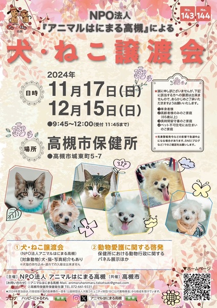 | イベント内容 | 高槻市保健所で開催する 今年最後の譲渡会です 参加犬さん3匹 猫さん6匹 詳しくは アニマルはにまる高槻HP ブログ「ハッピーにゃるわん」 インスタグラム「アニマルはにまる高槻 X「アニマルはにまる高槻」をご覧ください お待ちしています! |