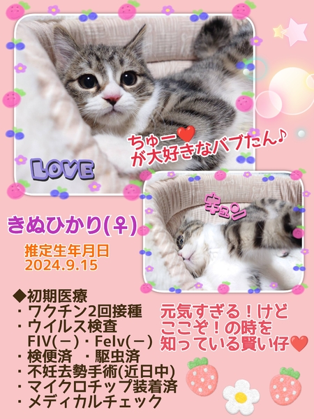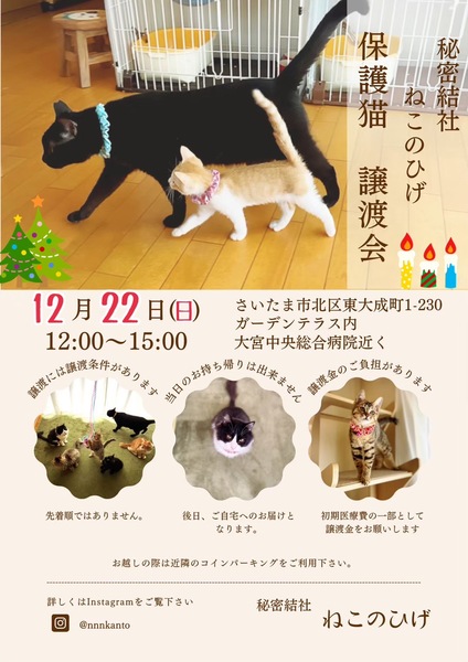 | イベント内容 | 【秘密結社ねこのひげ♡保護猫譲渡会】 2024年譲渡会納め♪ 12/22(日) 12:00~15:00 さいたま市北区東大成町1-230 金子建材内 ガーデンテラスにて 保護猫譲渡会を開催します☆ ほどよい大きさの ちびっ子ギャングたちや♪ 小童には負けへんでー! な魅惑的なモフモフオトナ猫も♪ 10頭弱が参加予定です♪ 年内ラストの! チャリティー物販もあります♪ 未来のご家族さまと 愛し愛されな 両想いになれますように♡ 家族にするなら保護猫だべ♪♪ こんなご時世だけど 新しい家族と笑顔で暮らしたい♪ という方は是非会いにいらしてください♡ ご不明な点がございましたら インスタグラム @秘密結社ねこのひげ の DMまでお問い合わせ下さい☆ |