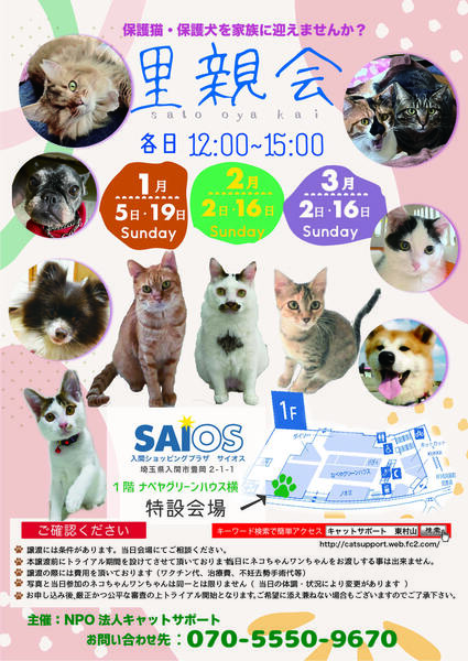 | イベント内容 | ◎1月19日 ◎2月2日・16日 ◎3月2日・16日 ※猫ちゃん・ワンちゃんの体調・天候により時間変更・中止になる場合が御座います。 ※当日に猫ちゃん・ワンちゃんをお渡しする事は出来ません。譲渡には条件があり、詳細は当日会場にてご相談ください。 |