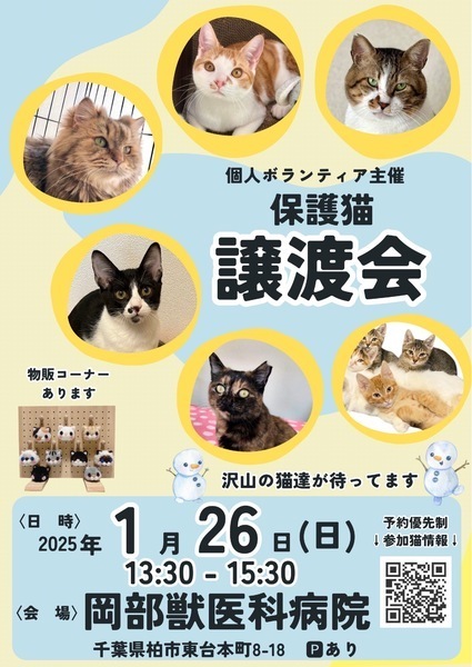 | イベント内容 | 個人ボラが集い開催! 保護猫ちゃんお迎えご検討の際はご相談から大歓迎です(=^x^=) 参加予定一覧↓ お問い合わせ欄はこちらのリンクから↓ https://lit.link/c8bf52d5-3ef4-4ea4-856a-92b8bd4cd24f 譲渡条件は各保護主ボランティアにより異なります。 予約無しでのご来場可能ですが、会いたい猫ちゃんがいる場合は事前お問い合わせ・予約をオススメします! |