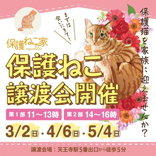 | イベント内容 | 毎月第1日曜の11時~13時と14時~16時の2部制にて「保護ねこの家 譲渡会」を開催しています。 会場は、天王寺駅から徒歩5分。 会場横には、コインパーキングもあります。 また、同日同時刻に「保護ねこの家 オンライン譲渡会」も開催しています。 子猫から大人猫までたくさんの保護猫たちが参加します。 是非、会場まで足をお運びください。 ------------ 【 日時 】 毎月第1日曜 第1部:11時~13時 第2部:14時~16時 ※1部と2部では参加猫が異なります 【 会場 】 Bear's Kitchen 大阪市阿倍野区旭町1丁目1-22 山本ビル1F 【 アクセス 】 大阪メトロ 天王寺駅 5番出口 西へ徒歩5分 会場横にコインパーキング(有料)あり ▾アクセス動画▾ https://youtu.be/fx1OtVDPgl4 【 参加条件 】 参加費は無料となります 予約や事前エントリーなどは不要です 未成年者のみ・高齢者のみのご来場はご遠慮ください 【 参加猫 】 当会SNSにて開催7日前より順次案内いたします ▾Instagram▾ https://www.instagram.com/hogonekonoie_st/ ▾X(Twitter)▾ https://twitter.com/hogonekonoie_st ▾ブログ▾ https://ameblo.jp/hogonekonoie/theme-10113553723.html/ 【 詳細情報やお問合せ 】 当会Webサイトをご確認ください ▾保護ねこの家 Webサイト▾ https://www.hogonekonoie.jp/jotokai/ ------------ |