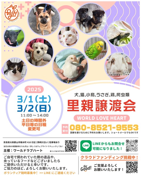 | イベント内容 | ワールドラブハートで里親募集中の動物たちの譲渡会を開催します! 犬猫だけではなく、インコやウサギ、チンチラに亀などたくさんの保護動物がいます! みんな新しい家族を探しています。写真だけでは伝えきれない魅力が盛りだくさん! 実際に会ってそのかわいさを実感してください♪ ★里親募集中の動物たち★ https://satoya-boshu.net/foster/?@button_name@=search&FosterParent_MemberID=1161 ・犬、猫 ・インコ ・ウサギ ・チンチラ ・ハムスター ・小鳥 ・チャボ ・カメ ……など 子犬や子猫もたくさんいますよ♡ ぜひお気軽にお越しください! ●混雑をさけるために、事前予約をお願いします。 予約番号080-8521-9553 ショートメールでも可♪ ●当日までに譲渡が決定した・体調がすぐれないなど、やむを得ない理由で不参加の場合があります。ご希望の子がいましたら、当日お問い合わせください。 ●当日、その場での引き渡しはしておりません。譲渡決定後、自宅訪問を兼ねてこちらからお届け致します。 ご来場お待ちしております♪ ★world love heart(ワールドラブハート)は、奈良県大和郡山市で活動している動物保護団体です。 『引き取り依頼は断らない』をモットーに、犬、猫、鶏、小動物、家畜、爬虫類など捨てられた動物を保護しています。 ◎ホームページ https://worldloveheart-nara.jimdofree.com ◎公式YouTube https://www.youtube.com/@wlhnara9868 https://www.instagram.com/world_love_heart_/?locale=ja_JP |
