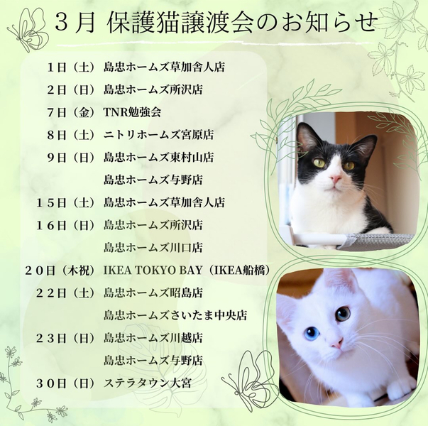 | イベント内容 | 保護猫カフェねこかつさん主催の保護猫譲渡会です☺︎ ねこかつさんや個人ボランティアさんの元で大切にお世話された、ちびっ子や大人猫ちゃんがたくさん参加します どなた様もご自由にご参加いただけます*♪ ❁譲渡には譲渡条件がございます ❁お申込みの際にはアンケートへのご記入がございます ❁当日に猫ちゃんを連れて帰ることはできません |