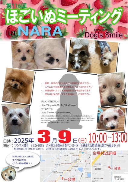 | イベント内容 | 3月9日(日曜日)10時~13時、奈良県大和高田市のワンネス財団エモーショナルリテラシーセンターをお借りして「第116回ほごいぬミーティングat奈良大和高田」を開催します。 保護犬を家族に迎えようと考えている方、保護犬に会ってみたい方、保護犬について知りたい方、ぜひご来場ください。 相性を見るためなど先住わんこさん、卒業わんこさんのご参加ももちろんOKです。 当日は、Dog's smileグッズやワンコ用品の販売、Dog's smileを応援してくださる方々が手作りされた手作り雑貨などの販売も行います。どれもお買い得です。 また、売り上げは、私たちの活動資金になります。ぜひご協力をお願いします。 来場者のみなさまには、感染症の予防に御協力をお願いします。 ・発熱・風邪の症状のある方の入場は御遠慮願います。 ・入場時は、手指消毒への御協力をお願いします。 ・来場者の状況により、入場制限を行う場合があります。 なお、来場予定のワンコについては、活動ブログでご確認ください。 日時 令和7年3月9日(日)午前10時~午後1時 場所 ワンネス財団エモーショナルリテラシーセンター 奈良県大和高田市東中2-10-18 (近鉄南大阪駅高田市駅から南に徒歩14分) 協力 ワンネス財団、株式会社松田電気工業 |