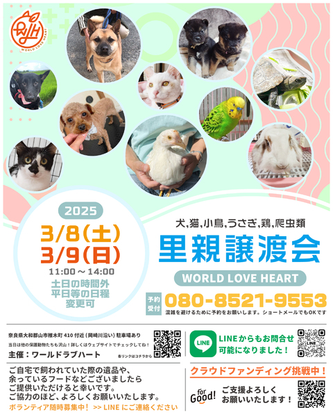 | イベント内容 | ワールドラブハートで里親募集中の動物たちの譲渡会を開催します! 犬猫だけではなく、インコやウサギ、チンチラに亀などたくさんの保護動物がいます! みんな新しい家族を探しています。写真だけでは伝えきれない魅力が盛りだくさん! 実際に会ってそのかわいさを実感してください♪ ★里親募集中の動物たち★ https://satoya-boshu.net/foster/?@button_name@=search&FosterParent_MemberID=1161 ・犬、猫 ・インコ ・ウサギ ・チンチラ ・ハムスター ・小鳥 ・チャボ ・カメ ……など 子犬や子猫もたくさんいますよ♡ ぜひお気軽にお越しください! ●混雑をさけるために、事前予約をお願いします。 予約番号080-8521-9553 ショートメールでも可♪ ●当日までに譲渡が決定した・体調がすぐれないなど、やむを得ない理由で不参加の場合があります。ご希望の子がいましたら、当日お問い合わせください。 ●当日、その場での引き渡しはしておりません。譲渡決定後、自宅訪問を兼ねてこちらからお届け致します。 ご来場お待ちしております♪ ★world love heart(ワールドラブハート)は、奈良県大和郡山市で活動している動物保護団体です。 『行政機関からの引き取り依頼は断らない』をモットーに、犬、猫、鶏、小動物、家畜、爬虫類など捨てられた動物を保護しています。 ◎ホームページ https://worldloveheart-nara.jimdofree.com ◎公式YouTube https://www.youtube.com/@wlhnara9868 https://www.instagram.com/world_love_heart_/?locale=ja_JP |