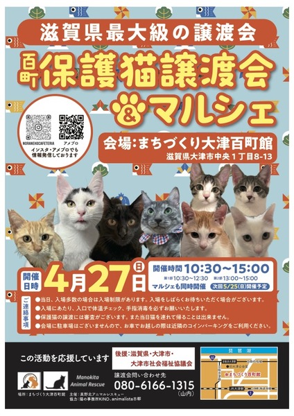 | イベント内容 | 滋賀県最大級の保護猫譲渡会。 毎回40頭以上の猫さんが参加します。 初めての方でも安心して譲渡の安心サポートの譲渡会です。 予約不要、入場無料。 参加猫さんのご紹介は https://ameblo.jp/hyakucyojyoutokai または、Instagram @hyakucyoujyotokai をご覧下さい。 ※ 後援 滋賀県、大津市、大津市社会福祉協議会 |