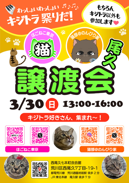 | イベント内容 | キジトラいっぱい『キジトラ祭り』です! とても可愛いのになかなかお声がかからないキジトラ。 猫部@のんびり家さんと一緒にキジトラを応援します♡ キジトラ好きさん、集まれ〜! もちろん、キジトラ以外も参加します。 私たちの譲渡会は、猫好きさんがふらっと立ち寄れるアットホームな会です。 月に一度、尾久や駒込近隣で開催しています。 リアル参加猫の他にまだご縁に恵まれない猫たちをパネル展示で紹介します。 保護猫譲渡会は子猫希望者が多く、大人猫の希望者はわずかです。保護猫は子猫だけではありません。私たちは大人猫にも幸せに暮らせるお家を見つけてあげたいのです。 近年、猫を展示する譲渡会だけではない、新しい形の里親募集が増えています。私たちも様々な形で、譲渡活動を継続していきたいと思っています。 応援よろしくお願いいたします。 ======= ほごねこ東京譲渡会in尾久 3月30日(日) 13時〜16時00分 西尾久七本町会会館 荒川区西尾久7丁目-19-1 都電荒川線 荒川遊園地前駅 徒歩2分 JR東北本線 尾久駅 徒歩7分 ======= ●予約不要、入場無料です。 ●室内は靴を脱いでいただきます。 ●手指消毒のご協力をお願いいたします。 ●アンケート用紙にご記入ください。 ●お申し込みしたい猫が見つかりましたら、スタッフにお声がけください。生活環境や条件についてヒアリングさせていただきます。 ●お申し込みの有無は保護主が判断します。お話の順番をお待ちいただく事があります。 ●お申し込みの際に、1匹1000円の運営協力金をお願いしております。トライアル(パネル参加の子はお見合い)が成立しない場合も返金はいたしません。 ●トライアル(パネル参加の子はお見合い)決定の有無は後日お電話かSMSにてお知らせいたします。再度ヒアリングさせていただく事がありますのでご了承ください。当日決定はしません。 ●参加予定の猫が欠席、または変更する場合があります。 ======= <基本譲渡条件> ・ペット可物件に居住 ・ご家族全員の同意と面談 ・完全室内飼育(ベランダ、庭、帰省先や旅行先への同伴不可) ・空調などによる室温管理 ・責任と愛情をもって終生飼育 ・適切な医療措置(先住猫についても同様) ・質の良いフードの継続 ・不妊手術の実施と報告 ・脱走や危険防止対策 ・清潔な環境とお部屋の整理整頓 ・全てのお部屋の出入りが自由(特別な場合を除く) ・一部の医療費と支援金のご負担 ・身分証明書を提示と契約書の取り交わし ・写真数枚や動画付きの定期報告 ======= ※お申し込みをお断りさせていただく可能性があるケース ・一般的にご自身で終生飼育が難しい事が予想される方 (20年以上生きる長生きの子が増えています。最後までしっかりお世話する事ができるか、よくお考えください。子猫・幼猫希望は55歳位までを目安としておりますが、徒歩圏内に後見人がいるなど、条件次第で変わります。) ・子猫・幼猫希望でお留守番時間が長い方(お子様や高齢者のみのお留守番は不可です。) ・脱走防止など、安全対策に全面協力していただけない ・自動製品に頼りすぎなど、毎日の健康管理を怠っている ・安定収入(経済力)がない方 ・未成年、単身の方、妊娠中の方、高齢の方 ・個々が経済的に自立していない同棲カップル ・お部屋が狭い、猫が走り回れるスペースを確保できない(譲渡目安:1LDK〜、約40平米〜。猫により狭いお部屋でも可能な場合があります。) ・先住犬、ハイシニアの先住猫がいる ・喫煙者多数、動物に配慮しない喫煙者がいる ・ご家族お揃いで面談ができない(特別な場合を除く) ・お引っ越し予定がある など 保護主や、猫によって希望条件が異なります。 |