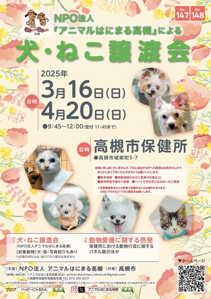 | イベント内容 | 高槻市保健所にて開催させていただきます 参加犬さん6~7匹位 猫さん5~7匹位 体調やご機嫌により変更になる場合もございます ご質問等 スタッフにお問い合わせくださいませ 詳しくは アニマルはにまる高槻HP ブログ「ハッピーにゃるわん」 インスタグラム「アニマルはにまる高槻 X「アニマルはにまる高槻」をご覧ください みんなでお待ちしています! |