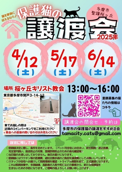 | イベント内容 | 【多摩市聖蹟桜ヶ丘】保護猫譲渡会 多摩市を中心に猫ボランティア協働で保護猫の譲渡会を開催しています。 事情があって保護された猫さんたちが参加予定です。 チラシに付いてるQRコードまたはこちらのリンクから 猫たちの様子が見れます。 https://sites.google.com/view/cooneru/ 完全予約制ではありませんが、予約された方から優先的にご案内致します。 参加お申込み・お問合せはコチラ tamacity.cats@gmail.com 【日時】4月12日(土) 13:00〜16:00 【場所】桜ヶ丘キリスト教会 多摩市関戸3-14-12 (聖蹟桜ヶ丘駅徒歩8分) ※車でお越しの際は近隣のコインパーキングをご利用下さい。 【譲渡までの流れ】 ①譲渡会にて猫を決めたら預かりボランティアに話を聞く ②エントリーシートに記入 ③お届け(里親様宅へお伺いします) ④トライアル期間 ⑤誓約書を交わして本譲渡 【譲渡地域】 多摩市・府中市・日野市・八王子市・立川市・国立市・稲城市・相模原市・町田市・麻生区、他 【譲渡条件】 ①ペット可住宅にお住まいで、同居の方全員の了解がある ②経済的・体力的・時間的に猫を養える見込みがある ③完全室内飼い ④終生飼育 ⑤子猫の場合は留守にする時間が短いご家庭 ※単身者・高齢者の方には後見人必須 |