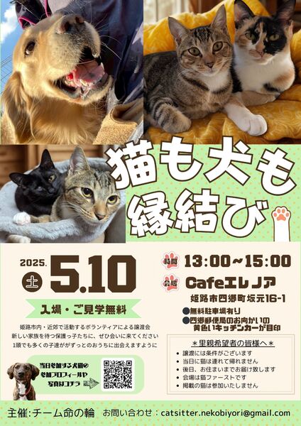 | イベント内容 | チーム命の輪が主催の譲渡会が開催! 姫路市・近郊で活動するボランティアによる ?猫ちゃん&?わんちゃんの譲渡会です☀️ 新しい家族を待つ保護っ子たち 保護猫保護犬を迎えたい方、悩んでいる方など ご相談にいらしてもかまいません。 ぜひ会いに来てください❤️ 1頭でも多くの子たちが、 “ずっとのおうち”と出会えますように?✨ ✉ お問い合わせ:catsitter.nekobiyori@gmail.com ⚠ 里親をご希望される方へ ⚠ ・譲渡には条件とお手続きがございます ・当日に猫や犬を連れて帰ることはできません ・後日、改めてお届けをさせていただきます ・写真の猫は参加猫ではありません |