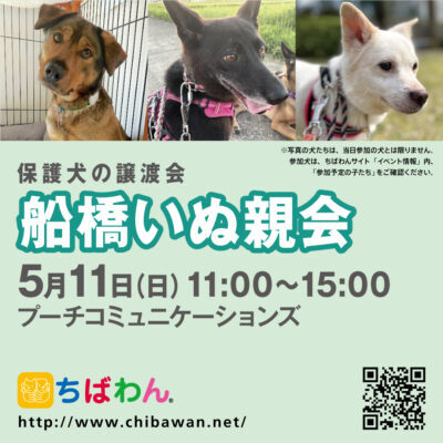 | イベント内容 | 5月船橋いぬ親会のご案内です。 poochさんのご厚意により、プーチコミュニケーションズ(船橋市駿河台)のドッグランをお借りして「船橋いぬ親会」を開催することになりました。 屋根付きのドッグランでの開催になります。 【ちばわんからのお願い】 ①会場内ではマスクの着用をお願いします。 ②発熱がある方や体調が悪い方は来場をご遠慮ください。 ③会場内が密にならないよう入場制限をさせていただく場合があります。 開催日:5月11日(日)11:00~15:00 屋外開催(屋根付きドッグラン) 小雨決行 場所:プーチコミュニケーションズ 千葉県船橋市駿河台2-9-1 【アクセス】 飯山満駅から徒歩約20分 JR東船橋駅から徒歩約20分 県道8号線 吹上交差点~駿河台交差点間にあるファミリーマートの裏手になります。 リサイクルショップとファミリーマートの間の道へ進み、最初のT字路を左折してください。 ※店舗の駐車場は5台分のみとなりますので混雑時にはご利用いただけない場合がございます。 満車の場合はコインパーキングをご利用下さい。 《お知らせ》 ◆会場ではチャリティグッズを販売します 売上金は保護した犬猫の医療費など、 ちばわん活動費として大切に使わせていただきます 《お問い合わせ》 いぬ親会について:http://chibawan.net/inquiry_chiba ※いぬ親会当日はメールが見られません。また、お問い合わせの際は、必ず「具体的な件名」を入れて多数の迷惑メールと区別がつくようにお願いいたします。 ※本イベントに関するPoochさんへのお問い合わせはご遠慮ください。 船橋いぬ親会イベントホームページ https://chibawan.net/event/20250511-funabashi-dog ちばわんホームページ https://chibawan.net/ |