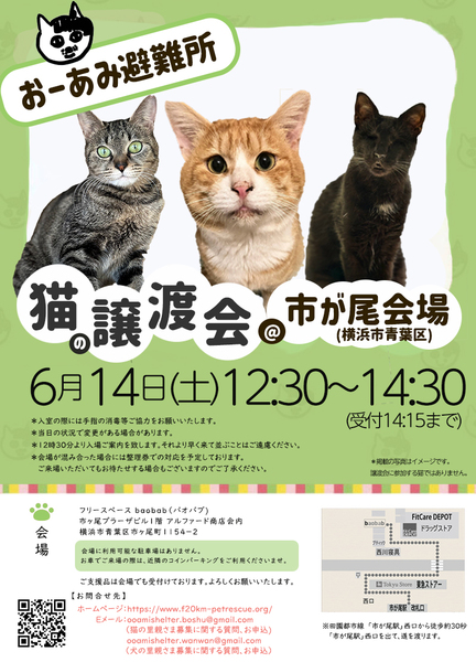 | イベント内容 | ☆★☆★☆★☆★☆★☆★☆★☆★☆★☆★☆★☆★☆ ~6月14日(土)市ヶ尾にて譲渡会開催!~ ◎場所・・「スペースbaobab」 神奈川県横浜市青葉区市ヶ尾町1154-2 市ヶ尾プラーザビル1階アルファード商店会内 田園都市線「市ヶ尾」駅西口より徒歩約30秒 ◎日程・・6月14日(土)(雨天決行) ◎時間・・ 12:30~14:30 (会場に利用可能な駐車場はございません。近隣のコインパーキングをご利用ください。) *参加の際は、アルコール消毒のご協力をお願いいたします。 *混雑状況により、入場制限をさせていただく場合がございます。 ※参加予定の犬猫は体調により参加できない場合があります。ご了承ください。 ☆★☆★☆★☆★☆★☆★☆★☆★☆★☆★☆★☆★☆ |