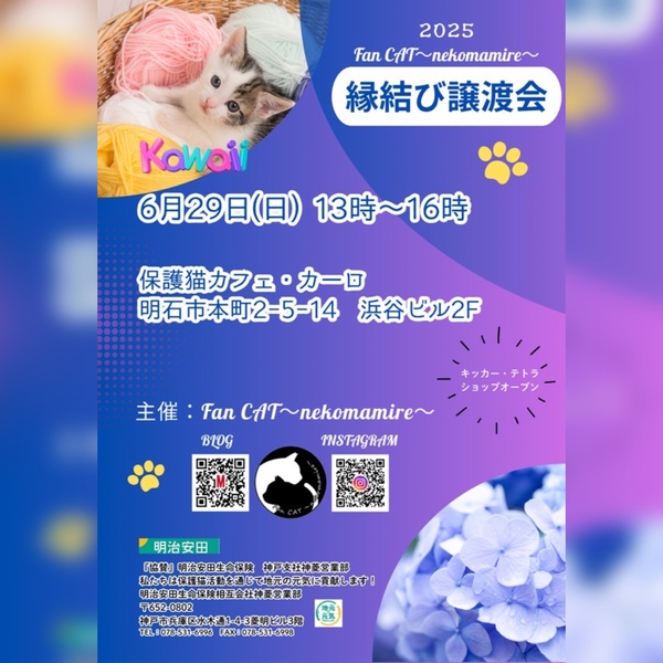 | イベント内容 | 縁結び譲渡会 2025年6月29日(日)13時~16時 場所:明石市本町2-5-14 浜谷ビル2階 保護猫カフェ・カーロ 事務所側 (譲渡会のお問合せはカーロさんにしないようにお願いします) Pは近くにコインパーキングがたくさんありますのでご利用お願いします 中猫さん大人猫も参加していますので是非ご参加ください!! 参加の猫ちゃんたちはブログにて譲渡会1週間前から掲載しています https://mycatkobe.blog.fc2.com/ お見合いしたいと思われる方は、ブログのメールフォーム、InstagramのDMより お越しになる時間をご連絡ください ※譲渡は無料ではございません(譲渡会参加は無料です) ※譲渡条件がございます ※当日連れて帰れません ※※早い順ではございませんがご縁があれば早くに決まってしまう 場合がありますのでお見合いの予約かお早めにご来場ください 主催 Fan CAT~nekomamire~ |
