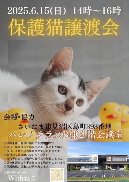 | イベント内容 | 子猫がどんどん保護されれる時期です 留守時間が長いおうちでも 一緒に過ごせる おとな猫も多数参加します いいご縁を結びにいらしてください ☆参加予定猫についてはこちらをご覧ください→譲渡会一週間前にYoutubeにて発表 ※当日、猫の体調・里親決定の場合は不参加になる場合がございます さいたま市近郊で活動している個人ボランティアさんが参加する 冷暖房完備の会議室をお借りして区切られたお部屋で ゆっくり猫と触れ合える環境でのアットホームな譲渡会です 大切に育ててきた子猫から大人猫までが参加します 入場は無料です ☆2019年3月より開催しております こちらの会場で しあわせにゃんこになった数は 400匹以上です ☆一匹一匹清潔な環境で丁寧に健康管理に気を付けて育てています※必要医療は全てかけています ☆里親様のご年齢により 高齢の猫の譲渡も行っています ☆初めて猫を飼う方でも不安がないよう アドバイスさせていただきます 【ご支援のお願い】 おうちで購入したけど食べなかったキャットフード・ペットシート・猫砂等ございましたら お持ちいただければ助かる命があります。ご協力お願いいたします 協力・会場 http://hare-terra.com ハレノテラスB棟 2階会議室【無料駐車場320台】 所在地 埼玉県さいたま市見沼区島町393番地 交通 【お車でお越しの方】 東大宮バイパスからのルート 東大宮バイパスを進み、「深作中」交差点を曲がり、見沼区島町(ハレノテラス)へ 県道5号線(新産業道路)からのルート 県道5号線を進み、「八雲神社入口」交差点を曲がり、さらに進み「東大宮駅入口」を曲がり、見沼区島町(ハレノテラス)へ※島小学校向かい 【電車でお越しの方】 JR宇都宮線(湘南新宿ライン・上野東京ライン)東大宮駅「東口」下車 駅前通りをまっすぐ徒歩13分 【バスでお越しの方】 JR宇都宮線東大宮駅東口より 国際興業バス「大和田駅行き」3分乗車 「東大宮7丁目」バス停 下車徒歩3分 東武野田線大和田駅 国際興業バス「東大宮駅行き」6分乗車 「東大宮7丁目」バス停下車 徒歩3分 ※お見合いをして 譲渡後希望の場合は会場で申し込みをし 譲渡条件と照らし合わせ 決定の場合は 後日 ご自宅へお届けし 譲渡契約を結んでいただきます ※医療費・光熱費の一部等は 譲渡費用のご負担がございます 次の子の保護に使わせていただきます ※猫の飼育に必要な ゲージなどのご購入・脱走防止対策等をお願いします ※購入したけどおうちの猫ちゃんが食べなかったフード・使わなかった猫砂・ペットシート ご支援大歓迎です 主催・お問い合わせ Withねこ https://nekotomo.localinfo.jp Youtube https://www.youtube.com/@withneko2222 Instagram https://www.instagram.com/withneko2222 |