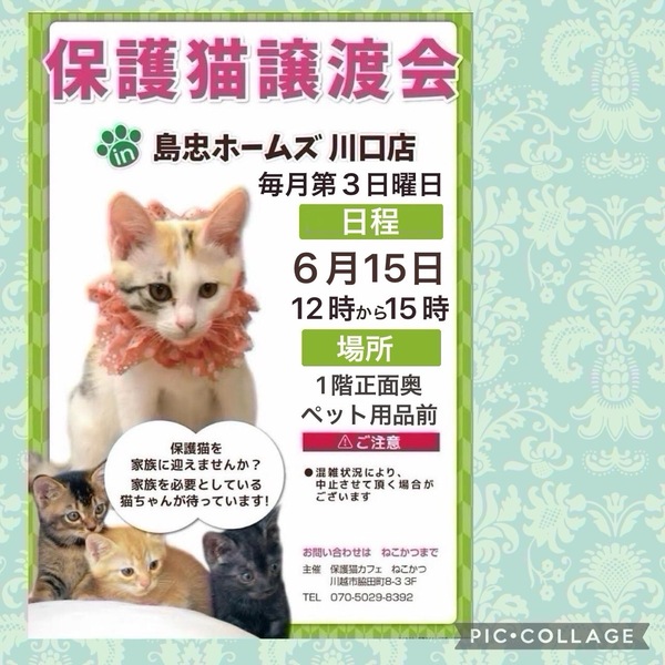 | イベント内容 | 6/15(日)島忠ホームズ川口店保護猫譲渡会 *保護猫讓会* 日時:6/15(日)12時~15時 場所:ホームズ川口店さま 島忠ホームズ川口店さま譲渡会に参加予定です。 センターからの引き出し、飼育崩壊や所有権放棄などで、生きる場所を失った猫たちが、最大限の医療にかけてピカピカになりました。 写真の猫の他にも甘えっこちゃんたちが、溢れる笑顔でお待ちしています。 ぜひご参加ください。 ***譲渡条件*** *完全室内でお願いします *逸走防止対策にご協力頂ける方 *写真付きの身分証をご提示頂ける方 *LINE若しくはメールでのやりとりが可能な方 *譲渡に関する覚え書きにご署名頂ける方 *初期医療費をご負担頂ける方 *その他の譲渡条件を、譲渡会場でお話させて頂ける方 *猫が生まれた年から20年後に、80歳を超えていない方 *お一人暮らしの方は、後見人さまのご同席が必要です |