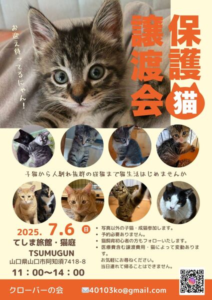 | イベント内容 | 予約不要・参加料無料です。 ミルクから育てた子猫はじめ元野良猫の成猫まで多くの子が参加します。 猫飼い始めての方もフォローいたします。猫との生活初めてみませんか。 みんな人馴れしたかわいい子です。 インスタで参加の子を紹介しています。随時更新中です。 https://www.instagram.com/kurobanokai/ |