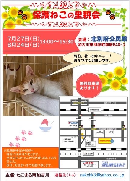 | イベント内容 | ねこまる南加古川さん主催の里親会です。 参加猫ちゃんは、子猫から大人猫まで! 可愛い猫グッズの販売やバザーもしています。 無料駐車場がございますので、ご利用ください。 保護された保護ねこたちはずっとのおうちで これからの猫生を幸せに暮らすため 慣れない場所・知らない猫たちが一同に集まる この会場で怖いながらも頑張っています! *当日、猫を連れて帰ることはできません *譲渡には保護主さんごとに条件があります *譲渡会は猫ファーストです 大きな声や猫の負担になる行為は控えていただけますようお願いいたします。 *お子様をお連れの方は、お子様と事前に猫ちゃん静かなのが好きだよ 叫ばない、大きな声を出さない、手を勝手に入れない ようお約束をしてきていただけますよう、お願いいたします。 |