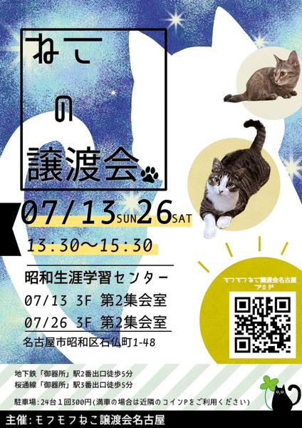 | イベント内容 | モフモフねこ譲渡会名古屋 猫たちの幸せなお家探しのために譲渡会を開催しております。 個人ボランティアの集まりです。 自分たちの出来ることから頑張っております! 一匹でも幸せになれる猫が増えますように 場所 昭和生涯学習センター 第2集会室 住所 名古屋市昭和区石仏町1-48 時間 13時30分~15時30分 交通機関等 地下鉄「御器所」鶴舞線2番出口南約300m 桜通線3番出口南東約300m 駐車場24台(満車の場合は近隣コインPをご利用ください) 参加猫の情報は下記モフモフねこ譲渡会名古屋ブログにてご確認ください。 https://mofumofuneko4.fc2.net/ 【譲渡会について】 ・譲渡会は入場無料、予約不要です。お気軽にご参加ください。 ・会場へのお問い合わせはご遠慮ください。 ご質問は下記メールアドレスへお願いいたします。 mofumofuneko4☆gmail.com ☆を@に変更してお問い合わせください。 ・猫の引き取りはしておりません。 ・譲渡会当日に猫をお渡しすることはありません。 ・保護主によって譲渡条件が違う場合があります。 ・参加予定でも譲渡会前にトライアルになる場合があります。 ご希望の猫がいましたらまずはお問い合わせをお願いいたします。 【参加猫について】 ・ノミ駆除、駆虫、トイレ躾、ワクチン3種接種済。 ・年齢や健康状態に応じて、避妊手術を行っております。 ・参加予定で紹介していても当日体調不良等で欠席になる場合があります。 【譲渡の約束事】 ・ペット飼育可の住宅にお住まいの方。 ・完全室内飼育。 ・脱走防止の対策をしていただける方。 ・避妊手術未実施の場合、避妊手術 の実施と報告をしていただける方。 ・ご家族全員が猫を飼うことに同意していること。 ・譲渡後、しばらく定期連絡を入れていただける方。 *お一人暮らしの方、60歳以上の方は、身内の方の保証が必要となる場合がございます。 #名古屋昭和区 #昭和生涯学習センター #譲渡会 #保護猫 #地域猫 #さくらねこ #tnr #里親募集 #里親募集中 #猫 #ねこ #殺処分ゼロ #買わずに飼おう #モフモフねこ譲渡会名古屋 #ペットショップに行く前に #譲渡会のお知らせ #猫と暮らしたい |