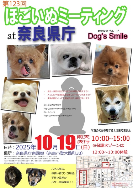 | イベント内容 | 10月19日(日曜日)10時~15時、奈良県庁の南回廊部をお借りして「第123回ほごいぬミーティングat奈良県庁」を開催します。 保護犬を家族に迎えようと考えている方、保護犬に会ってみたい方、保護犬について知りたい方、ぜひご来場ください。 相性を見るためなど先住わんこさん、卒業わんこさんのご参加ももちろんOKです。 当日は、Dog's smileグッズやワンコ用品の販売、Dog's smileを応援してくださる方々が手作りされた手作り雑貨などの販売も行います。どれもお買い得です。 また、売り上げは、私たちの活動資金になります。ぜひご協力をお願いします。 来場者のみなさまには、感染症の予防に御協力をお願いします。 ・発熱・風邪の症状のある方の入場は御遠慮願います。 ・入場時は、手指消毒への御協力をお願いします。 ・来場者の状況により、入場制限を行う場合があります。 なお、来場予定のワンコについては、活動ブログでご確認ください。 日時 令和7年10月19日(日)午前10時~午後3時 場所 奈良県庁 南側回廊部分 奈良市登大路町30 (近鉄奈良駅から東に徒歩10分、 JR奈良駅から市内循環バス外回り「県庁前」降りてすぐ) 協力 奈良県、奈良県獣医師会 |
