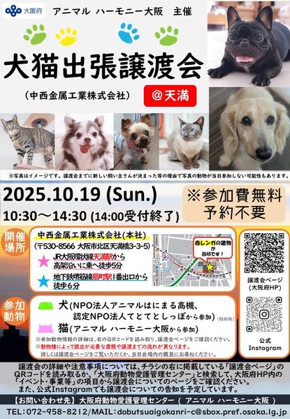 | イベント内容 | 大阪府アニマルハーモニー大阪主催の 犬猫出張譲渡会に参加させていただきます NPO法人アニマルはにまる高槻からは 保護犬さん5匹参加 認定NPO法人てとてとしっぽさんから保護犬さん参加 アニマルハーモニー大阪からは保護猫さん参加 です! 新しい家族を迎えようとお考えのみなさま 是非おいでくださいね~? |