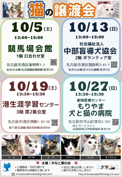 | イベント内容 | =みなと猫の会 第214回譲渡会のお知らせ== 新しい家族を待つ猫たちに 会いに来ませんか? ◆ペットショップへ行く前にぜひ譲渡会へ◆ トイレトレーニングや 基本的な健康診断を終わらせた 生後2ヶ月~11才くらいの 猫たちが大集合! ○主 催 みなと猫の会 ○日 時 10月13日(日)13:00~15:00 ○場 所 社会福祉法人 中部盲導犬協会 2階ボランティア室 愛知県名古屋市港区寛政町3-41-1 あおなみ線「荒子川公園」駅下車 徒歩3分 https://goo.gl/maps/2AbfTAW5NG32 ※敷地内駐車場は職員専用のため ご利用は御遠慮ください ※車でお越しの場合は近隣の コインパーキング等をご利用ください ※お問い合わせは会場ではなく minatonekonokai@gmail.com まで ○参加猫について ・参加している猫は、ワクチンや駆虫等の基本治療を済ませています。 また、年齢に応じて避妊去勢手術を行っています。 ・参加予定猫が体調不良などで急遽不参加になることもあります。 ○ご来場の皆様へ ・譲渡会の見学は入場無料・予約不要です。 ・当日に猫をお渡しすることはありません。 後日ご自宅までお届けに伺います。 ・一週間から二週間のトライアル期間後、正式譲渡となります。 ・トライアル及び譲渡の際には 完全室内飼い・ご家族の同意・脱走防止策・ アンケート記入など諸条件がございます。 ・里親様には治療費の一部ご負担をお願いしております。 これ以上不幸な猫を増やさないための 治療費とさせて頂きますので何卒ご理解ください。 ・非会員の個人保護者も参加しています。 譲渡条件やトライアルは猫の保護者に準じます。 ・譲渡会の流れ http://minatoneko2014.blog.fc2.com/blog-entry-11.html ○参加猫情報は随時更新中! ↓↓参加猫一覧↓↓ http://minatoneko2014.blog.fc2.com/blog-entry-493.html ○猫に関する相談も受け付けています ねこについての困りごと、トラブルなどを抱えている方、 相談へいらっしゃいませんか。 ○次回以降の譲渡会予定 日時:10月19日(土)13時30分~ 場所:港生涯学習センター 3階 第2集会室 名古屋市港区港陽1丁目10−18 地下鉄名港線「港区役所」駅より徒歩9分 日時:10月20日(日) 14時~ 名古屋市動物愛護センター 愛護館 名古屋市千種区平和公園2丁目106 地下鉄名城線「自由ヶ丘」駅より徒歩11分 (主催:名古屋市動物愛護センター) 日時:10月27日(日)13時30分~ 場所:動物医療センター もりやま犬と猫の病院 愛知県名古屋市守山区深沢2-101 ゆとりーとライン「志段味西小学校」バス停留所 徒歩2分 ◎主催者ブログ みなと猫の会 ~こぴっと猫だより~ http://minatoneko2014.blog.fc2.com/ ◎参加者のブログ myままさんブログ「にゃんこの宝箱」 http://wagayamama.cocolog-nifty.com/jiru/ 犬白ママさんブログ「犬白日記」 http://k531.blog25.fc2.com/ uzumakinecoさんブログ「猫ときどき雨」 http://uzumakineco.blogspot.jp/ sion1226さんブログ「さとおやさがし」 http://sion1226.blog.fc2.com/blog-entry-1.html ■上記ブログに会ってみたい猫がいた!でも参加予定猫に入ってない、 どうすればいいの? ■譲渡会当日は都合が悪くて… それ以外の日に猫とお見合いがしたい! などのお問い合わせは minatonekonokai@gmail.com まで 写真1枚目 みつき ♂ 2~3才 ヒトが好き過ぎる超甘えん坊 ずっとナデナデされたりくっついていたいのです ☆★個性豊かな猫たちが皆様をお迎えします★☆ 猫とスタッフ一同、お待ちしております。 |