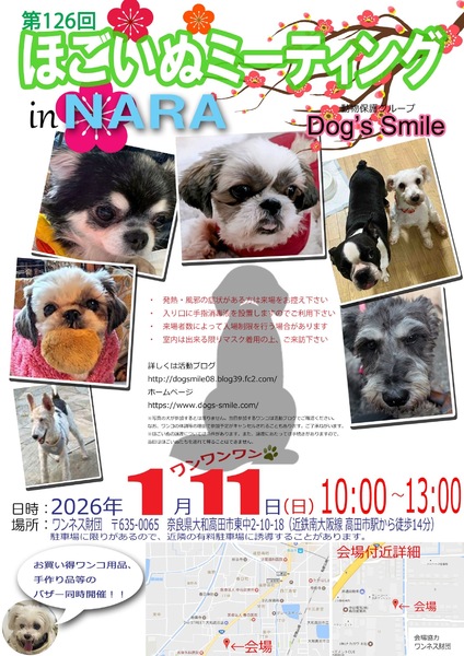 | イベント内容 | 1月11日(日曜日)10時~13時、奈良県大和高田市のワンネス財団エモーショナルリテラシーセンターをお借りして「第126回ほごいぬミーティングat奈良大和高田」を開催します。 保護犬を家族に迎えようと考えている方、保護犬に会ってみたい方、保護犬について知りたい方、ぜひご来場ください。 相性を見るためなど先住わんこさん、卒業わんこさんのご参加ももちろんOKです。 当日は、Dog's smileグッズやワンコ用品の販売、Dog's smileを応援してくださる方々が手作りされた手作り雑貨などの販売も行います。どれもお買い得です。 また、売り上げは、私たちの活動資金になります。ぜひご協力をお願いします。 来場者のみなさまには、感染症の予防に御協力をお願いします。 ・発熱・風邪の症状のある方の入場は御遠慮願います。 ・入場時は、手指消毒への御協力をお願いします。 ・来場者の状況により、入場制限を行う場合があります。 なお、来場予定のワンコについては、活動ブログでご確認ください。 日時 令和8年1月11日(日)午前10時~午後1時 場所 ワンネス財団エモーショナルリテラシーセンター 奈良県大和高田市東中2-10-18 (近鉄南大阪駅高田市駅から南に徒歩14分) 協力 ワンネス財団、株式会社松田電気工業 |