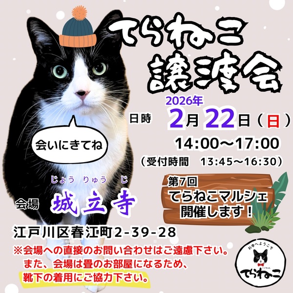 | イベント内容 | 子猫から成猫まで、たくさんの猫ちゃんが参加します。 7回目となる「てらねこマルシェ」も同時開催! 猫雑貨、アニマルコミュニケーションなど、猫好き以外も楽しめるイベントになる予定。 最新情報はInstagramで発信しています‼️ てらねこ譲渡会は、江戸川区支援ボランティアが運営を担い、区外の保護主にも門戸を開き、季節のお花に囲まれた美しいお寺、城立寺様のご協力の下、開催しています。 単身者、高齢者の方など、なかなかお迎えが叶わない方もご相談ください。 子猫から成猫までたくさんの可愛い猫ちゃんが参加します(体調不良の場合、予告なく不参加になる場合があります) 【第21回 てらねこ譲渡会】 日時:2026年2月22日(日) 14:00~17:00 (受付13:45/最終受付16:30) 会場:城立寺(じょうりゅうじ) 住所:江戸川区春江町2-39-28 https://maps.app.goo.gl/rE7j8HNxzK1VV3rAA?g_st=com.google.maps.preview.copy ・公共機関でお越しの場合 都営新宿線「瑞江駅」から徒歩12分 JR小岩駅から京成バス「小76」 バス停「名主屋敷」から徒歩すぐ ※敷地内に駐車スペースがあります(満車の際は近隣にコインパーキングもあります。 |