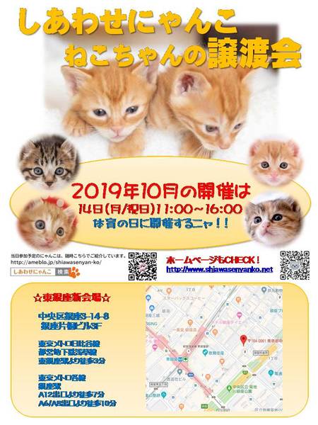 | イベント内容 | しあわせにゃんこは行き場のない猫ちゃんと里親様との出会いの場を提供するグループです♪ 子猫も成猫もハンデのある猫もみんな新しい家族を待っています♪ みなさまのご来場を保護主、スタッフ一同心よりお待ちしております♪ ◆開催日/開催時間◆ 2019年10月6日(日) 11:00~16:00 ご希望の猫ちゃんがいらっしゃる場合は11時30分までに受付をお願い致します。 複数のお申し込みがある場合は11時30分で受付を終了させて頂く場合がございます。 受付をされた全ての里親様とお見合いをさせて頂きます。 ※先着順ではございません ※当日、猫ちゃんを連れて帰ることは出来ません。後日、保護主が里親様宅へお届けいたします。 ◆会場◆ 東京都中央区銀座3-14-8 片桐ビル 3階(階段をご利用下さい) ※詳しいアクセスはHPをご覧下さい http://www.shiawasenyanko.net/jyoutokai.html ◆交通手段◆ 東京メトロ各線 銀座駅 A12出口徒歩6分 東京メトロ日比谷線 東銀座 A5出口徒歩2分 都営浅草線 東銀座 A5出口徒歩2分 ※お車でご来場の際、駐車場のご用意はございません。 近隣のコインパーキング等をご利用ください。 いつ里の掲載参加猫一覧はこちらから https://satoya-boshu.net/mypage/foster_list.php?@ps@=none アメーバブログの里親募集にゃんこはこちら https://ameblo.jp/shiawasenyan-ko/entry-12494061041.html?frm=theme ◆猫ちゃんとのお見合い◆ 掲載している猫ちゃんは基本的に譲渡会場でのお見合いのみとなります。 譲渡会への参加が決定している猫ちゃんはその譲渡会で里親様が決定しなかった場合のみ保護主宅でのお見合いが可能となります。 自宅お見合いを希望される里親様はメール(info@shiawasenyanko.net)にてご相談ください。 ◆当譲渡会では猫ちゃんと里親様のスキンシップを大切にしています◆ 新しい家族として20年以上いっしょに暮らしていく猫ちゃんです。 譲渡会場でたくさんの猫ちゃんと触れ合って良きパートナーを見つけてください。 はじめて猫ちゃんを迎える不安や先住猫ちゃんとのトライアルの注意点、猫ちゃんと里親様の暮らし方など気軽にご相談ください。 経験豊富な保護主や猫大好きスタッフがアドバイスさせていただきます。 ◆子猫ご希望の里親様◆ 子猫は急な下痢や発熱等により体調が急変し、数時間対応ができなかっただけでも命を落とす事があります。 その為、当譲渡会では月齢によりお留守番のない又は少ないご家庭への譲渡に限らせて頂いております。 また里親様と子猫ちゃんが安心してトライアル期間を過ごせるよう体重が1㎏程になってからのお届けとさせて頂いております。 ◆里親希望のみなさまへ◆ ご家族の皆様で生涯、家族の一員としてたっぷり愛情を注いでくださるご家庭をお待ちしております。 恐れ入りますが ・独身、単身者の方 ・友人同士、同棲でのお住まいの方 ・高齢者のみのご家庭の方 ・脱走防止対策にご協力頂けない方 はご希望に添えない場合もございますのでご了承下さい。 ※詳しくはその他連絡事項をお読みください。 ◆ご負担頂く費用について◆ 譲渡の際に譲渡負担金(医療費の一部、譲渡金、お届け時の交通費)を里親様にご負担頂く事により 過酷な状況にいる猫ちゃんを保護し新しいご家族の元へ送り出す事ができています。 皆様のご理解とご協力にボランティア一同、心より感謝しております。 ご負担頂く医療費につきましてはホームページに詳しく記載させて頂いております。 http://www.shiawasenyanko.net/onegai.html しあわせにゃんこホームページ http://www.shiawasenyanko.net メールでのお問い合わせ info@shiawasenyanko.net |