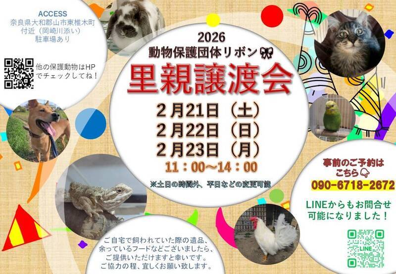 | イベント内容 | 自己紹介・活動内容など りぼんは、奈良県に拠点を置く動物保護団体です。 犬・猫・うさぎなどの小動物・インコやニワトリなどの鳥・両生類・爬虫類など動物種を問わず、お届け先も地域を問わず、動物たちと里親さまをつなぐ活動を行っています。 ◎ホームページ https://ribbon-foster.jimdofree.com/ ◎YouTube https://www.youtube.com/@ribbon-shelter https://www.instagram.com/ribbon_shelter1/(里親募集中の動物たち) https://www.instagram.com/ribbon_shelter/(ボランティア日記) Web Site https://ribbon-foster.jimdofree.com/ ribbon_shelter |
