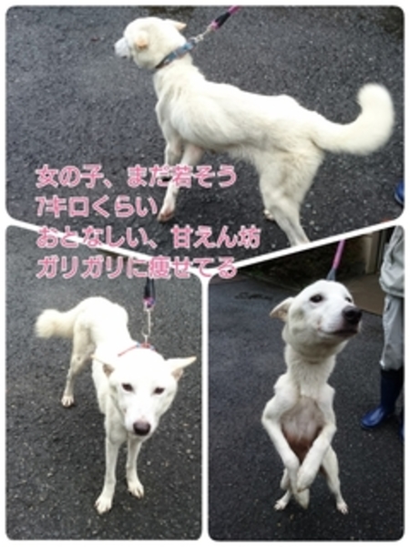 | 特徴(性格など) | すらっとした美形な顔立ちと真っ白な毛色の女の子です。耳の後ろにワンポイントの薄茶色が混じっています(*^^*) 現在約7kgでガリガリに痩せているため標準体重は2桁の中型犬程度と思われます。性格は大人しく甘えん坊です。 |
