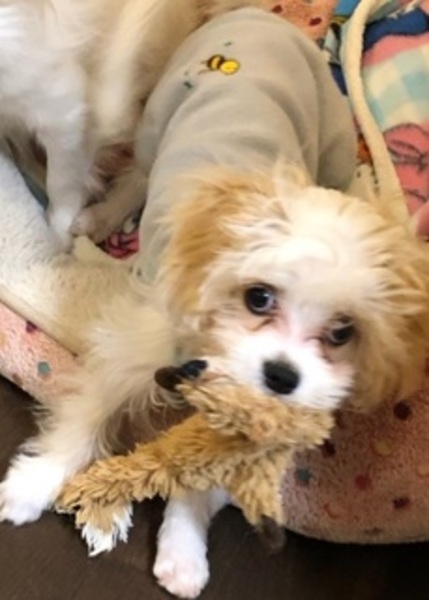 | 特徴(性格など) | 【名前】 カレーまん (雑種(キャバリアXマルチーズ)・オス)4〜5か月 3.4㎏ 【性格等】 人が大好きで甘えん坊。 社会性もバッチリ、子犬らしく元気です。 よく食べ、よく寝て、よく遊び、ウンチも良好! かわいい風貌ですが頑固な面もあります。 成犬に叱られながら社会性の勉強をしています。 時々しつこい時もありますが、怒られるとパッとやめ、とても聞き分けが良いです。 ハウスで静かにでき、シーツトイレはバッチリ。 その他のしつけは まだまだこれからです。 ハンデがあります。 股関節の稼働領域が狭く、足の運びが左右対称でないため、まっすぐ歩けずすぐに転んでしまいます。 レントゲンで骨格等を調べましたが股関節の造りに異常は見当たりませんでした。 筋力である程度カバーできると思います(治る、や正常に近い状態になる、という意味ではなく、歩様が若干不自然でも転ばずに歩けるようになるだろう、と見込んでいます)。 そのため現在は預かりさんのもとで日光浴と筋力アップのためお散歩練習を頑張っています。 本人は元気に走り回っているつもりでも、足がついていかず転んでしまい もどかしさがあるかもしれませんが できる限り怪我をしないよう配慮してあげてください。 カレーまん君は、まだ子犬ですので現在の性格や状態が確定的なものではありません。 接し方、環境によってはよく吠える犬にも、手が付けられなくもなりえます。 将来どのような犬になるのか、問題を助長させるのも、減少させるのも100%飼い主の責任です。 何があっても人まかせ、犬のせいにせず、この子を最後までかわいがって面倒をみる! という覚悟ある方にお渡ししたいです。 【健康状態】 ハンデがあります。 股関節の稼働範囲が狭いです(骨格に異常は見当たりませんでしたが成長途中なので将来的にどう変化していくかはわかりません。 |