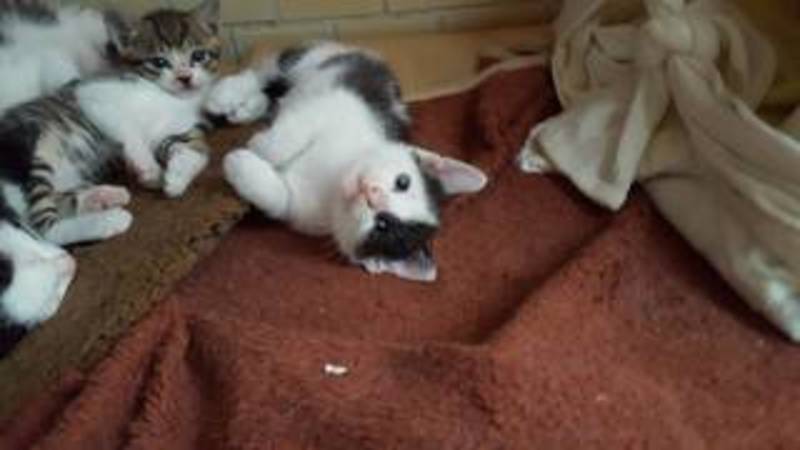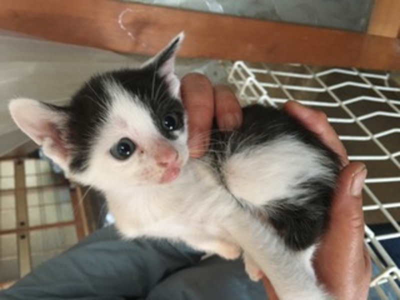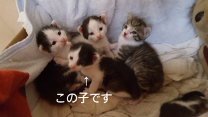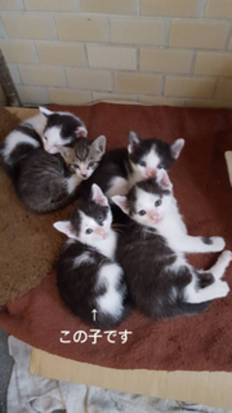 | 特徴(性格など) | 5兄妹の中の唯一の女の子です。 色は白黒です。 兄妹ともよくじゃれあう元気な子です。 たまに「あれ?1匹足りない!」と焦ったときはこの子がかくれんぼしています。 人に慣れ始めており、愛らしい女の子です。 |