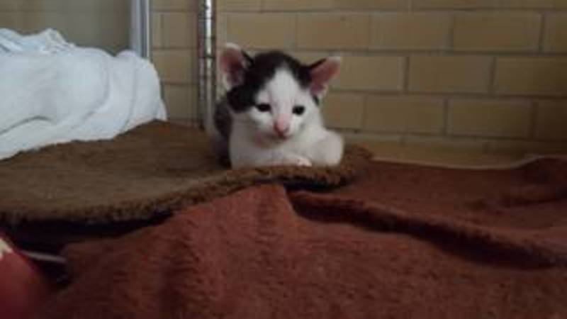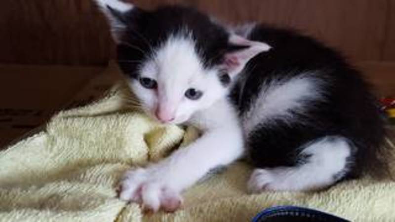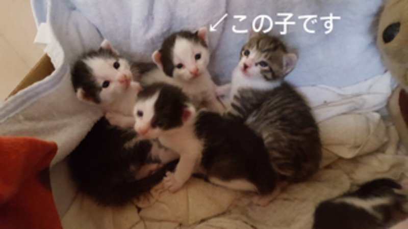 | 特徴(性格など) | 5兄妹の中で一番おっとり&のんびりさんです。 じゃれ合いを見ていても、どんくさいなぁ。と 思ってしまう場面が多々ありました。 白と黒の子猫ですが、前髪が禿げ上がったような 黒い模様がチャームポイントです。 人に慣れ始めており、大変愛らしい子です。 |