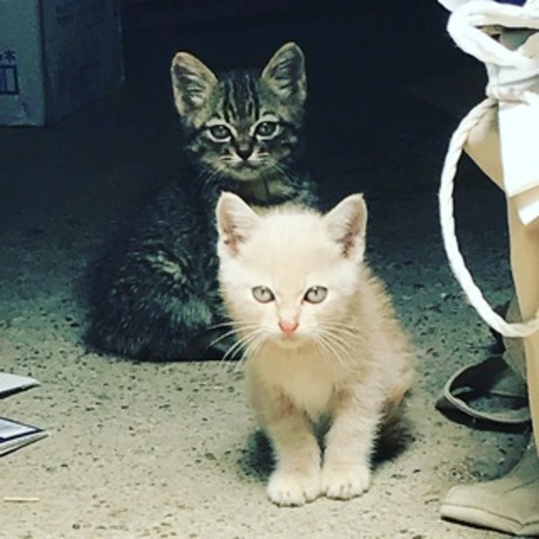 | 特徴(性格など) | 毛色はクリーム色と濃いめのサバトラの多分兄弟猫だと思います。目の色がクリーム色に青や緑などが入ってとても綺麗です♫まだ性別は調べられていません。 人には警戒心がまだ少しありますが、餌を食べている時や猫じゃらしで遊ばせている時は触れます。あと数日もすれば普通に触れると思います。 |