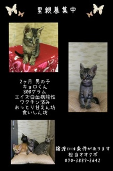 | 特徴(性格など) | 子猫 仮名「キョロちゃん」 生後2ヶ月 キジトラで目が大きくて可愛いです 現段階で エイズ白血病 陰性 寄生虫 陰性 |