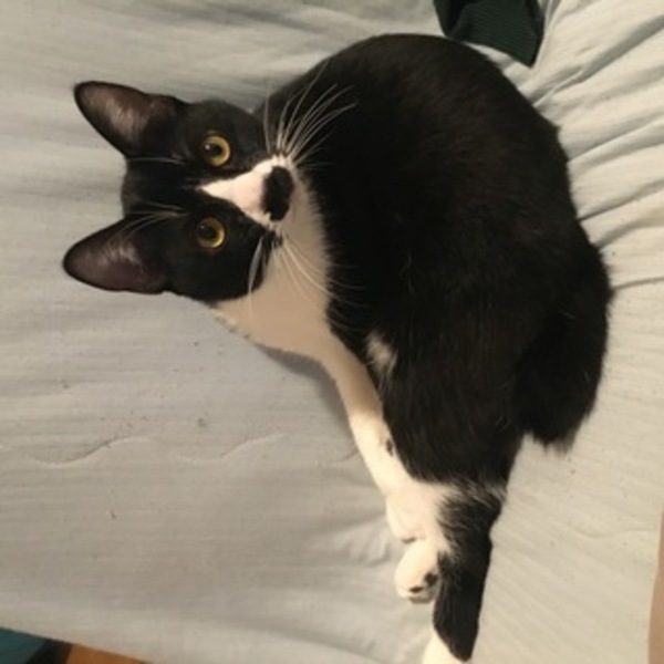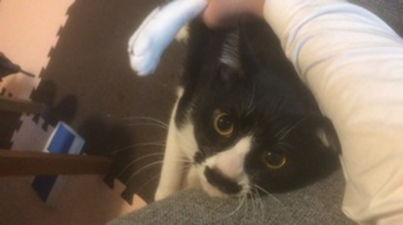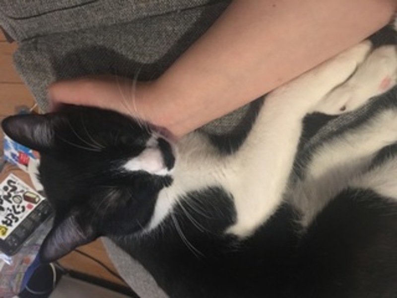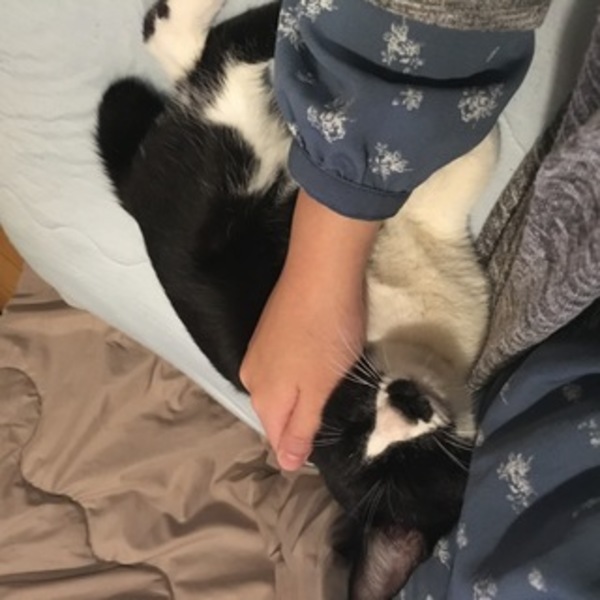 | 特徴(性格など) | 靴下にゃんこのような黒白の雑種です。性格はとにかく甘えん坊で人といることが大好きです。寝る時はほっぺたにすりすりしながら寝るほど甘えてきます。テレビを見ている時も膝に乗ろうとします。食欲旺盛な健康体で餌をあげると目を輝かせて喜びます。尻尾が短く鍵尻尾になっているので遊んでいる時などふりふりしていて可愛いです。トイレは躾済みで、ワクチンも摂取済み、去勢済みの男の子です。家に仕事のものが多かっため、日中はリードをつけて生活していました。 | ||