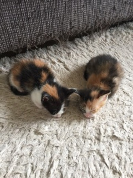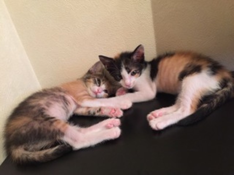 | 特徴(性格など) | 右の三毛猫がメイちゃん、左がミルクちゃんです。だいたいメイが好奇心旺盛で新しい遊びを見つけて、ミルクが真似する感じです。でもご飯に関してはミルクの方が食いしん坊さんです。生まれた直後から人の手で大きくなりましたので、威嚇行動は皆無。よく人に慣れて可愛い盛りです。いつも2匹で元気に遊んでいます。 | ||