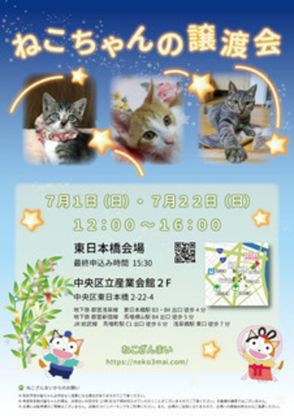| その他(譲渡条件など) | 7月22日(日)12:00〜16:00(最終申込15:30迄) ねこざんまい譲渡会に参加予定です! 《会場のご案内はこちら》https://ameblo.jp/neko3mai/entry-12390913226.html 希望の猫ちゃんがいる場合は、12時に会場へお越し下さい。 先着順ではございませんが、同じ猫ちゃんに複数名の希望者さまがいらっしゃる場合は、12時半にお見合い受付を締め切らせていただいております。 《家族募集中猫ちゃん一覧はこちら》http://www.neko3mai.com/entrycats/entrycats.html 《いつ里里親会情報ページはこちら》http://www.satoya-boshu.net/keiji/viewtopic.php?f=3&t=4828 ★★★ご来場前に必ずご確認下さい★★★ 《里親様へお願いはこちら》http://www.neko3mai.com/condition/condition.html 参加猫ちゃんは、それぞれ保護主(実際に猫ちゃんを自宅に入れ、保護をしている方)が異なります。 詳しい条件なども異なる場合がございますので、会場内で直接保護主とお話ください。 〖共通条件〗 1.終生飼育 2.完全室内飼い 3.脱走防止対策へのご協力 4.避妊去勢手術 5.契約書類へのサイン 6.定期報告 7.医療費等の負担 当日の猫ちゃんを連れて帰ることはできません。後日、保護主が里親様のご自宅までお届け致します。 その為、移動の際の猫ちゃんの負担を月齢などから考慮し、お届け地区を限定させて頂くこともございますのでご了承ください。 |