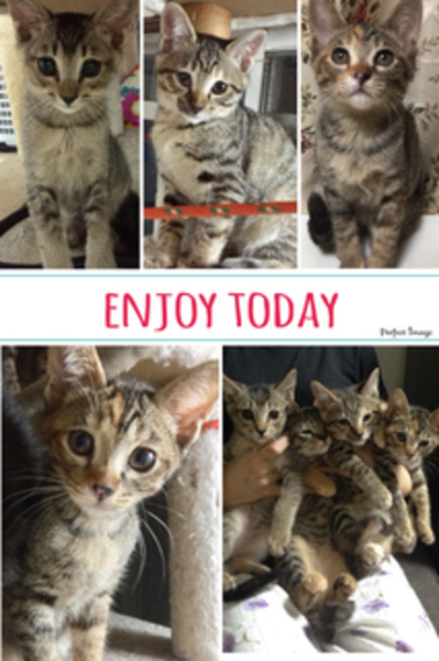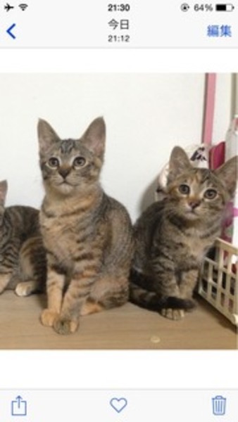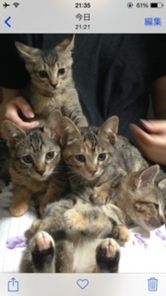 | 特徴(性格など) | キジ猫のメスが3匹 アビシニアン柄(雑種)が1匹です^_^ 兄弟で毎日元気に遊んでますが、甘えん坊の子、よく食べる子、よく遊ぶ子、だんだん個性が出てきました! |