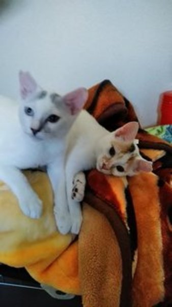 | 特徴(性格など) | 女の子がミャア 男の子がマロです。 頭が三毛で尻尾がシマシマが女の子。 縦眉で尻尾が短い鍵尻尾が男の子です。 避妊、去勢手術、ワクチン接種終ってます。 犬の共仲良く暮らせます。 |