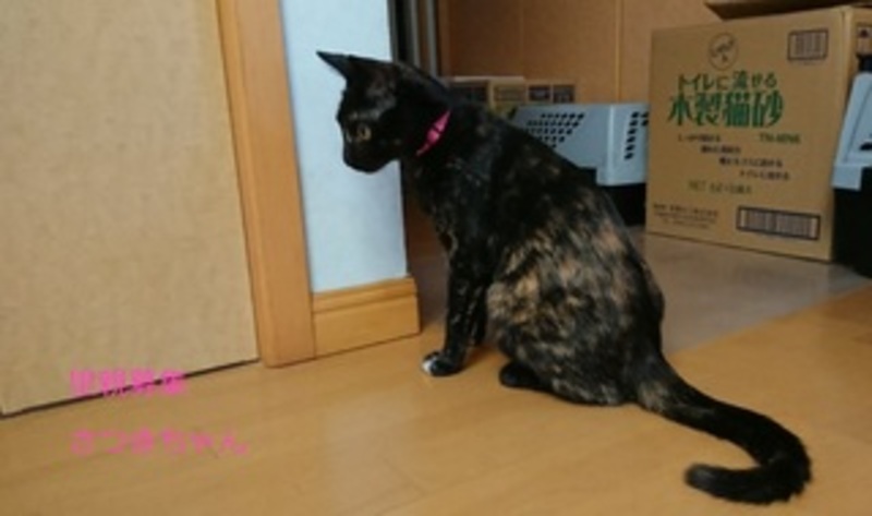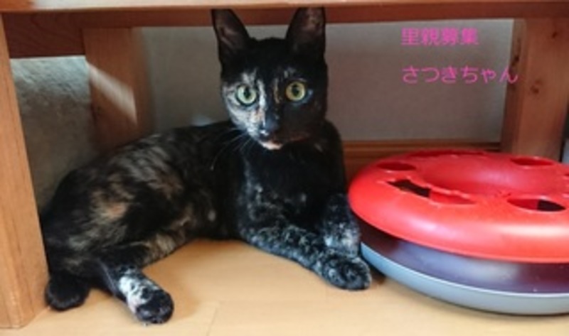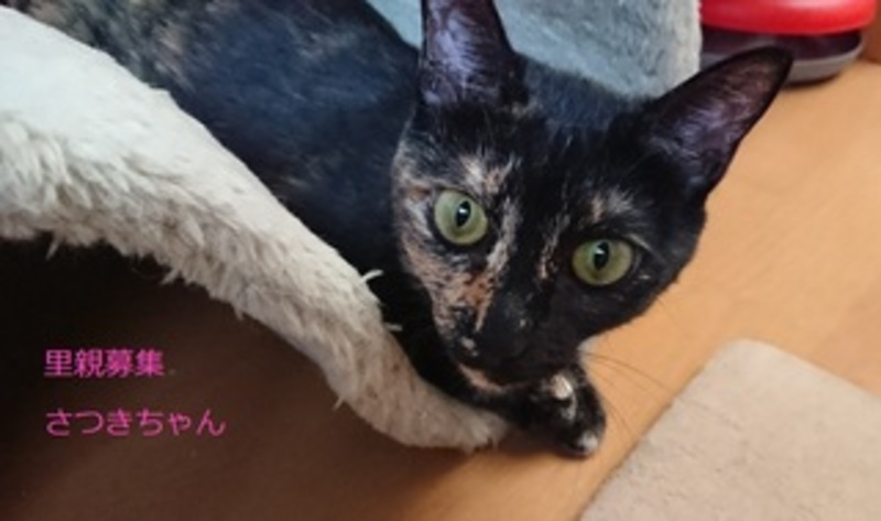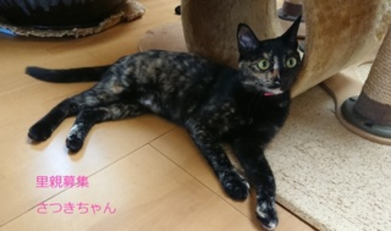 | 特徴(性格など) | さび猫、女の子、仮名:さつきちゃん 推定生後10ヵ月くらい、体重:3.5kg(8/7現在) 健康診断済み、駆虫済み(レボリューション5/27) 不妊手術済み(5/27) 血液検査-エイズ・白血病-共に陰性(5/27) 三種混合ワクチン接種(5/27) トイレしつけ済み 人慣れ抜群でゴロスリの甘えん坊さん、お膝が大好きです。 |