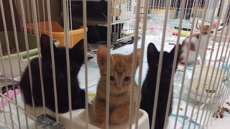 | 里親募集する理由 | 募集の経緯 TNR目的で保護した妊娠猫が6月2日に5匹の子猫(1匹は生後2日で死亡)を出産しました。 母猫(室内で子育て中)は子猫が離乳したら避妊手術をします。 子猫の譲渡は9月上旬です(今は母親や兄弟と今は過ごさせています) ・4匹いてとても賑やかですが、実際1匹1匹がみんなとってもやんちゃな子達です。それだけ元気で健康な証拠ですが、里親を希望される方は、ご自身のお住まいでご家族、ご近所にご迷惑が掛からないか、十分ご検討ください。必要に応じて、床の防音対策をしなければいけないこともあるかと思いますが、それでもなお苦情などは来ないでしょうか。 ケージを使い、遊ぶ時は遊ぶ、休む時は休むというオンオフを親である里親様がしてコントロールする状況が必要になってくると思われます。外出するとき、寝るときに猫達(特に小さい間)の安全のため、ケージを用意していただくようお願いします。4,50分から1時間半くらい遊んでご飯を食べればこてんと寝てしまいます。起きて多少ケージの中で遊べるように、2段もしくは3段のケージにしていただくと、長く使えると思います。(最近は災害も多いですので、慣らしておくと安心です。) 【2匹でのお迎えをご検討ください】 先住猫がいる場合、相性がお心配だと思います。この子たちは、よほどのことがない限り、気にしないと思いますが、反対にこの子たちの元気をどれくらい受け止めていただけるかが気がかりです。 おとなしい子だと難しいと思います。 兄弟(雌1雄3)、2匹づつでの譲渡を希望しています。相性はみんな仲良しなのですが、茶色2匹は近所のボス猫さんの子らしく、運動神経が非常にいいので、黒茶の組み合わせのほうがいいかもしれません。 健康状態 母猫から十分なミルクをもらって育ちました。 今は離乳食とカリカリをモリモリ食べています。 体重:1000g前後 ウイルス検査:未(母猫7/14実施 FIV/FeLV陰性) 検便:母猫の便を検査し、クリア ワクチン:末接種 特徴:夏に譲渡できるようにと兄弟で『夏』をテーマにした仮名を付けています。 普段は「えだ」ちゃんと呼んでいます。全身つやつや~の黒い毛です。お腹・太もも・うなじ?あたりに縞模様がうっすらあります(一年前に同じ母親から生まれた「あんず」がスモークのかかったような黒トラです。参考に、「あんず」の写真も載せておきますが、ここまでのトラ模様にはならないようです。) そして、「幸せの『かぎしっぽ』」です。長めの尻尾の先っぽ4分の1くらいが少しだけ曲がっています。 好奇心旺盛で一番先に行動します。カリカリを食べ始めたのもえだちゃんです。そして一番人懐っこいです。膝の上でグーグー寝てしまいます。おもちゃで遊んでいても、人にぴたっとひっついてもたれています。肩や背中にも乗ってきてかわいいですよ。 紅一点の「おり」です。男の子ばかりの兄弟で、すっかり「やんちゃ」になってしまいました。どの子ともよく遊び、負けていません。えだと同じく、膝に乗ってきてくれます。最近は女の子らしく、美人さんになってきて、一緒に住んでいる1歳年上の姉猫「あんず」と美しさを張り合っています(美人お姉ちゃんをライバル視しているようなしぐさがかわいいです)。えだとそっくりさんですが、並ぶと女の子っぽいですし、体も小さいです。 「かき」はぼーとしているように見えることもありますが、元気に飛び回ってます。ちょっと不思議な子です。変なところで休んだりしています。えだやきんの真似っこで楽しいことを覚えていってます。 「きん」は一番我が道を行くタイプです。ケージからも必ず一番最初に飛び出します。一番人馴れしてないところもあります。 かきときんの父親猫はその柄からうちの近所のとってもすばしっこい暴れん坊さんだと思われます。この父親譲りの運動神経で大人になると思いますので、脱走対策を入念にお願いします。 みんな元気いっぱいですので、いっぱいいっぱい遊んであげてください。おもちゃも大好きです。若いお兄ちゃんお姉ちゃんがいらっしゃるご家庭にも向いています。元気に走り回る子達ですが、生来、攻撃性はありませんのでご安心ください。母猫も保護して3か月ですが、ゴロゴロスリスリしてくれます。 募集条件 ★募集範囲【京都市内】(滋賀(湖西)、北大阪、京都府下は場合によりますのでお問い合わせください。) ★【9月上旬お渡し】【当方でのお見合い】【お宅確認のための訪問】【お届けでのお引渡し】【譲渡誓約書・避妊去勢手術誓約書(手術を一定期間の間に必ずしていただく旨)へのサイン】【身分証提示】【医療費負担】をご了承ください。 ☆【兄弟・母親と一緒】を優先します(基本兄弟一緒を前提)。 譲渡条件 ◎脱走防止対策の徹底(玄関や窓に具体的な脱走防止を自ら進んでできるかた) ・完全室内飼い(ベランダ・ハーネスを着けての散歩も不可) ・猫の飼える住居にお住いのかた(賃貸のかたは契約書を提示してください)で、引