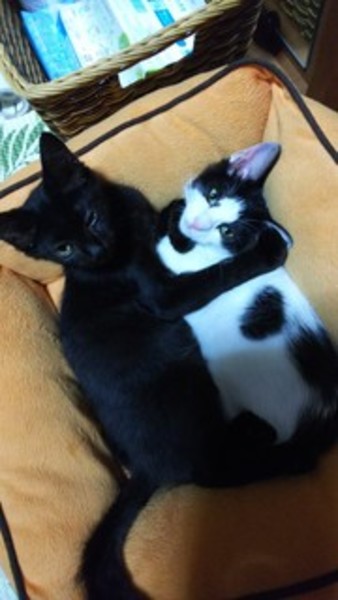 | 特徴(性格など) | 元気でやんちゃで甘えん坊。白黒と黒猫の兄弟。保護した時は長毛?と思ったが猛暑以来、耳毛以外は短くなりました。エイズ白血病陰性、ワクチン済。肩にものります。 | ||