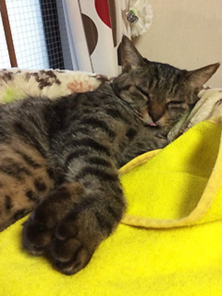 | 特徴(性格など) | 仮名を『きゅうちゃん』といいます。 きゅうちゃんはちょっと臆病で人見知りがありますが、 安心がわかり慣れると、控えめに甘えてきます。 そっと寄り添っていたいタイプの穏やかな女の子です。 ベタベタしているわけではないのですが、他の猫たちとも上手く共生しています。 きゅうちゃんは、好酸球性肉芽腫症候群というアレルギーがあります。 皮膚の表面に対する何らかの刺激(寄生虫、花粉の接触など)があると、 接触したものに対する過剰な反応(=アレルギー)がおきて、 傷ついてえぐられてしまった組織を埋めるために、 好酸球が現場へ急行し、 刺激に反応して肉芽組織がたくさん形成してしまうという難病です。 上唇が欠損していますが 食べること飲むこと 全く問題ありません。 現在何か継続して投薬や治療をしている、または必要ということはなく、 お腹の皮膚が(お腹の皮膚の一部がたまに赤くなってしまうのですが、現在無症状です。) 赤くなってしまっていないか気を配ってあげたり、症状が現れてしまった時には、 医療にかけていただける方であればきゅうちゃんは問題なく普通の子と同じように過ごせます。 現在フードは、適宜な処置として療法食を与えることもあります。 幼猫のお世話?をしてあげたりと、母性愛のある優しいきゅうちゃん。 もっと愛情を集中して注いでもらえる環境だったら、 きゅうちゃんは今よりもずっと人間に甘える幸せを感じてくれると思います。 きゅうちゃんのペースで気長に見守っていただけたらありがたく思います。 【好酸球性肉芽腫症候群とは】 参考資料。クリックすると別ページが開きます。 |