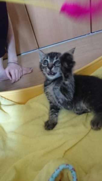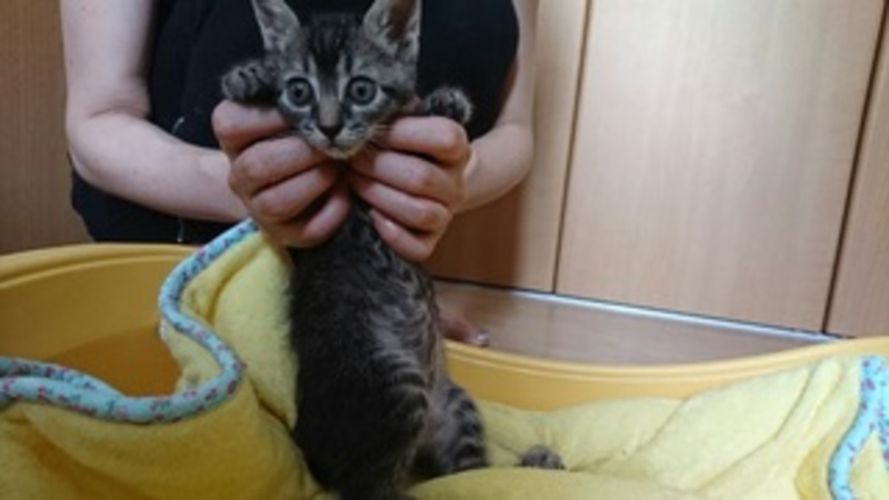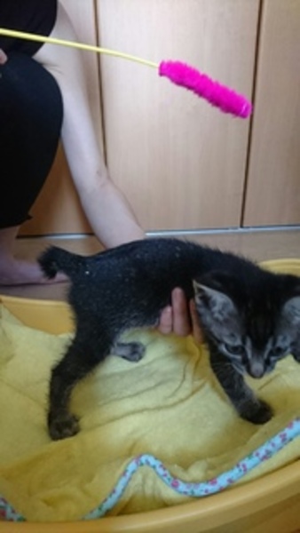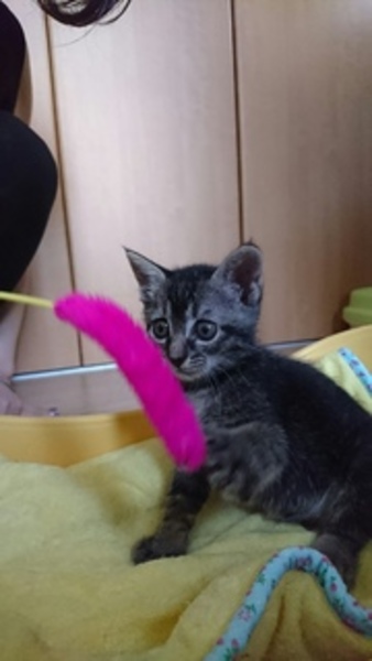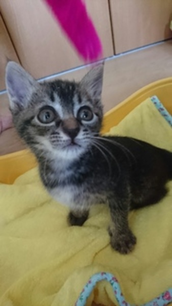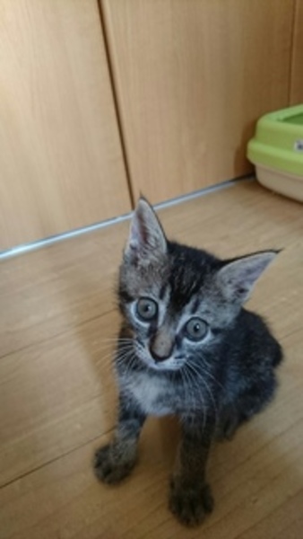 | 特徴(性格など) | 名前は「ひな(仮)」ちゃん。 黒の濃いキジトラです。シッポは短いです。 活発な仔です。ミルクから育てたので人間が大好きです。ワンちゃんと生活していますので、ワンちゃんを怖がりません。 ワクチン:未、ウイルス検査:未(生後2か月で実施予定) 駆虫:済 |