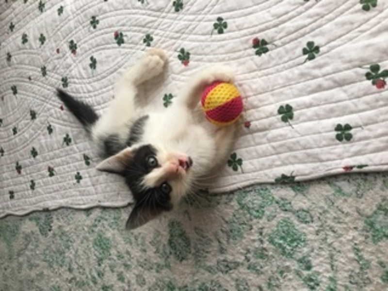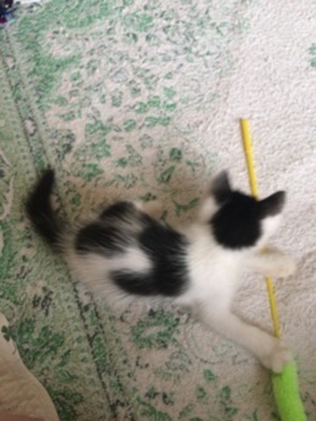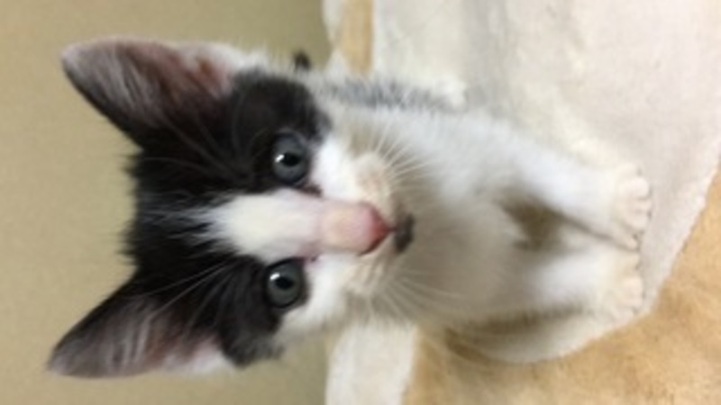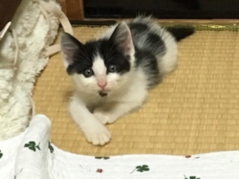 | 特徴(性格など) | 白黒模様で、背中に大きなにくきゅう模様のあるやんちゃな男の子。 拾った時、お腹がポンポコリンだったので仮の名を『ポコ』と呼んでいます。 とても活発、キトンブルーの色味がまだあるまんまるお目目でおもちゃを狙います。 布ボールやけりぐるみ、猫じゃらし等でコロンと転がり、そのポンポコお腹を見せてくれます。 遊ぶのに夢中で触ると甘噛みしてしまうこともありますが、人に爪は立てないし、だめ!と伝えるとちゃんと噛むのをやめる賢い子です。 トイレも覚え、上手に砂場を整えます。 ノミダニ寄生虫駆除、おりません。病気もなく、元気いっぱいです。 ご飯を持って行くと、控えめながらも『はやくはやく〜!』というように鳴く様はとても可愛いです。 |